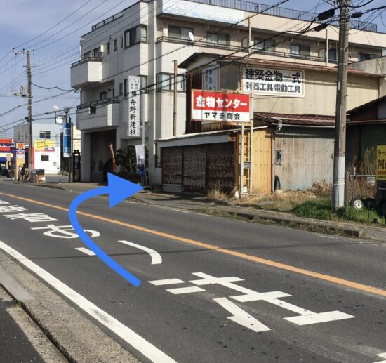 マツモトキヨシさんと、赤い看板「金物センター」さんを通り越して、左ウィンカーを出します。