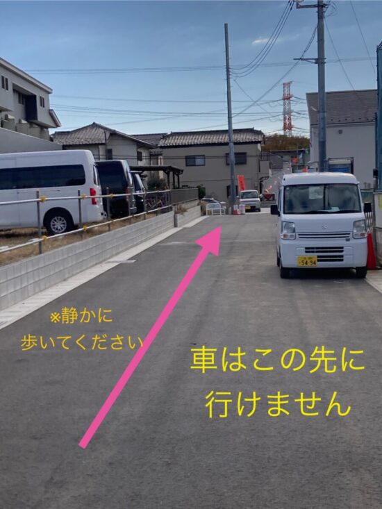 反対の右側には、コカ・コーラの自販機がたくさん積んであるところがあります。そこを過ぎたら駐車場です。看板がありますので、右折で入ってください