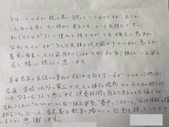 普段はお母様方と連絡をとったり感想を伺ったりすることが圧倒的に多いのですが、お父様方に伺ってみることも生徒さんを理解して行く上で、新しい視点をいただけるような気がしました。
